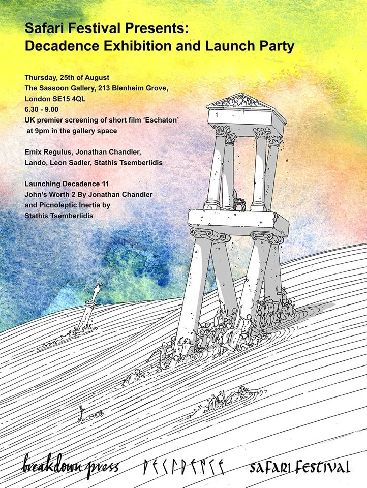 On the Thursday before the event, we'll be hosting an exhibition of work by Decadence Comics at Peckham's Sassoon Gallery, featuring the work of Lando, Stathis Tsemberlidis, Emix Regulus, Jon Chandler and Leon Sadler. Decadence will be launching Decadence 11, and Breakdown will be launching Picnoleptic Inertia by Stathis Tsemberlidis and John's Worth 2 by Jon Chandler. More info here.